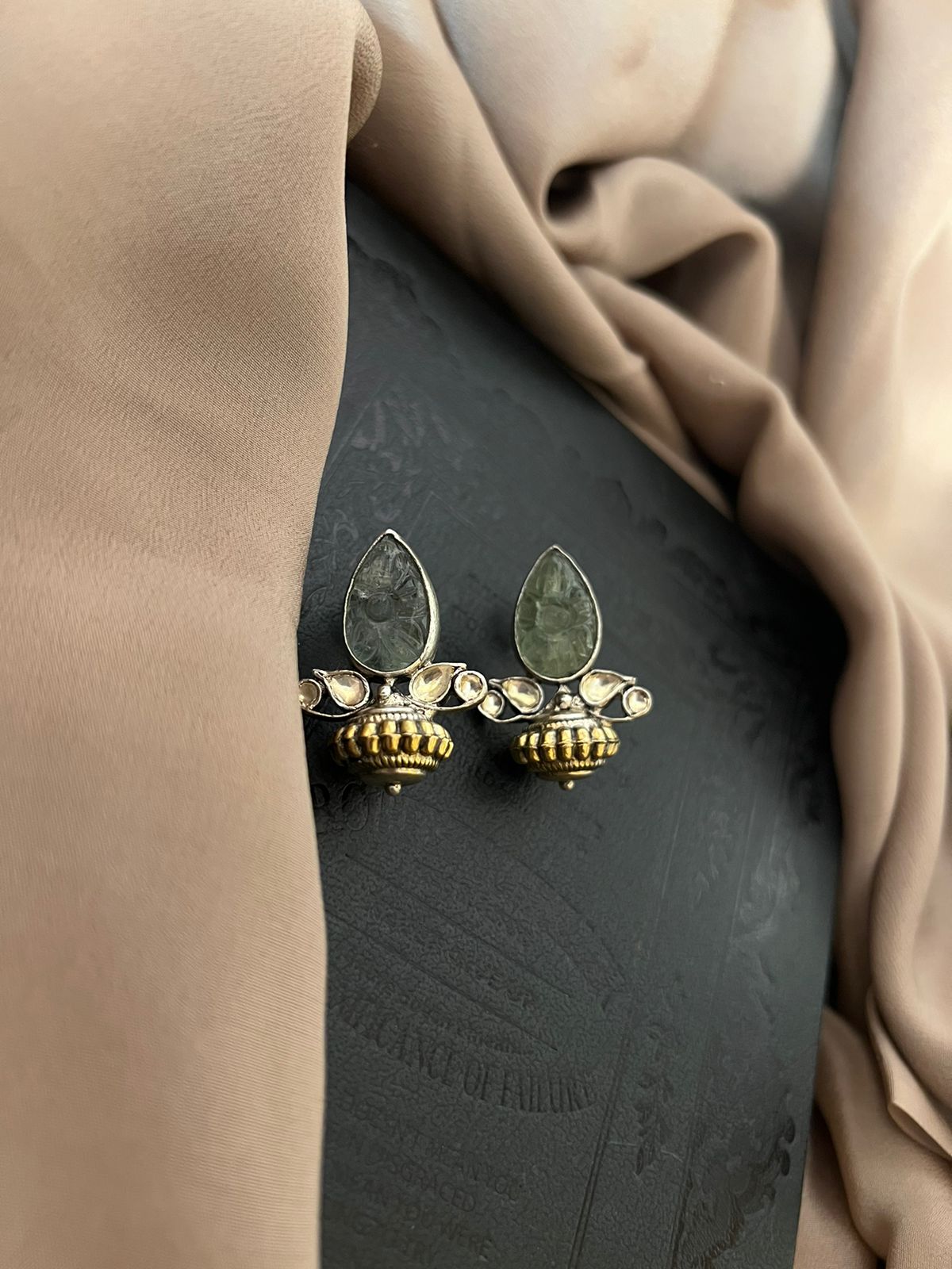 Products Name : Jhumka Style: Traditional Temple Jewellery Stone: Kemp Stone Weight: 33Grams Measurement : Length 2.5 Inches Fastening: Stud Material :
