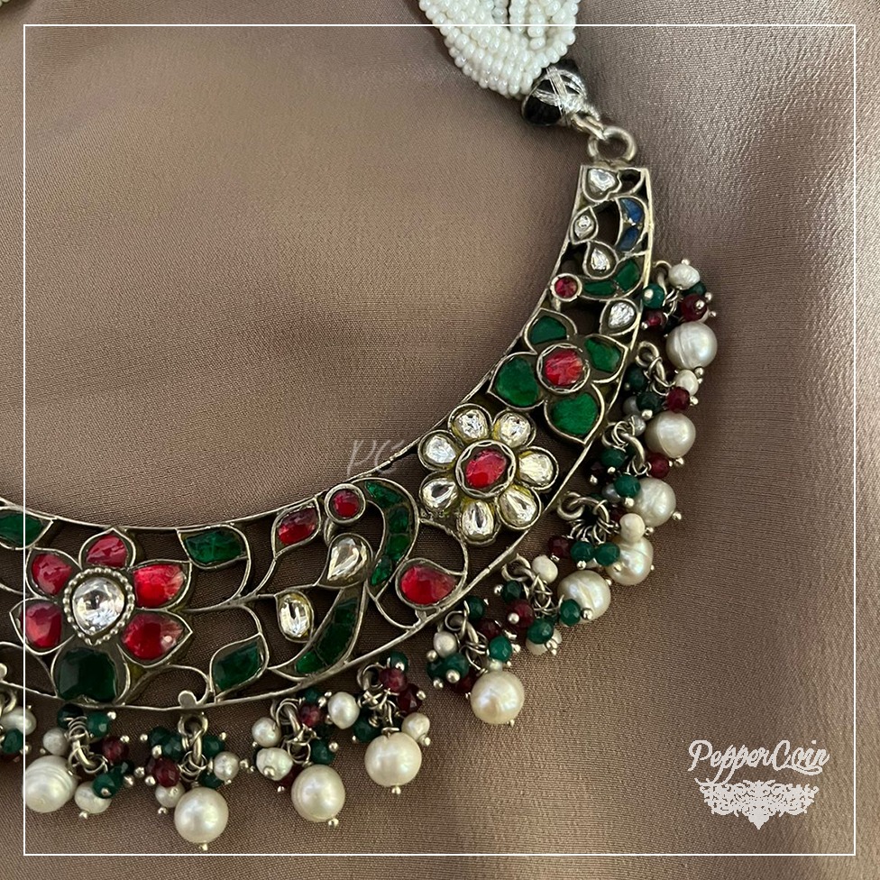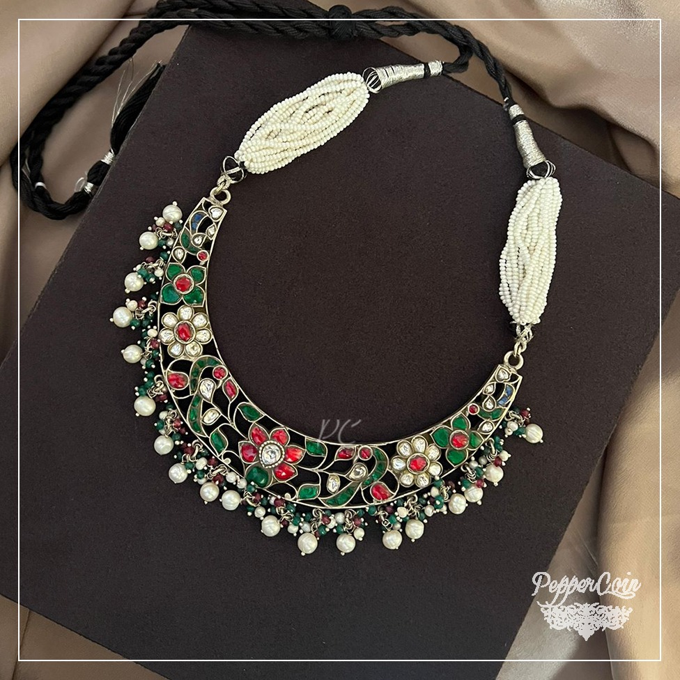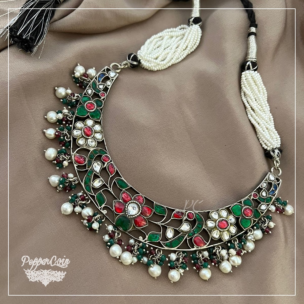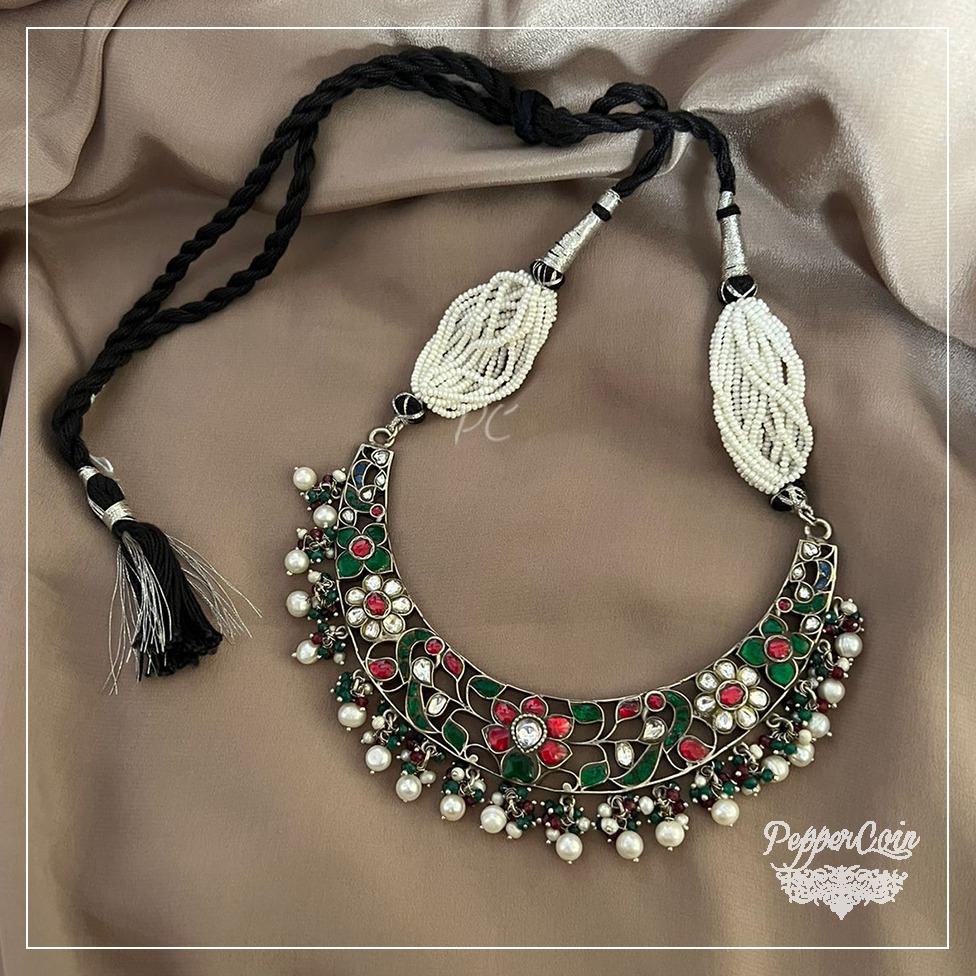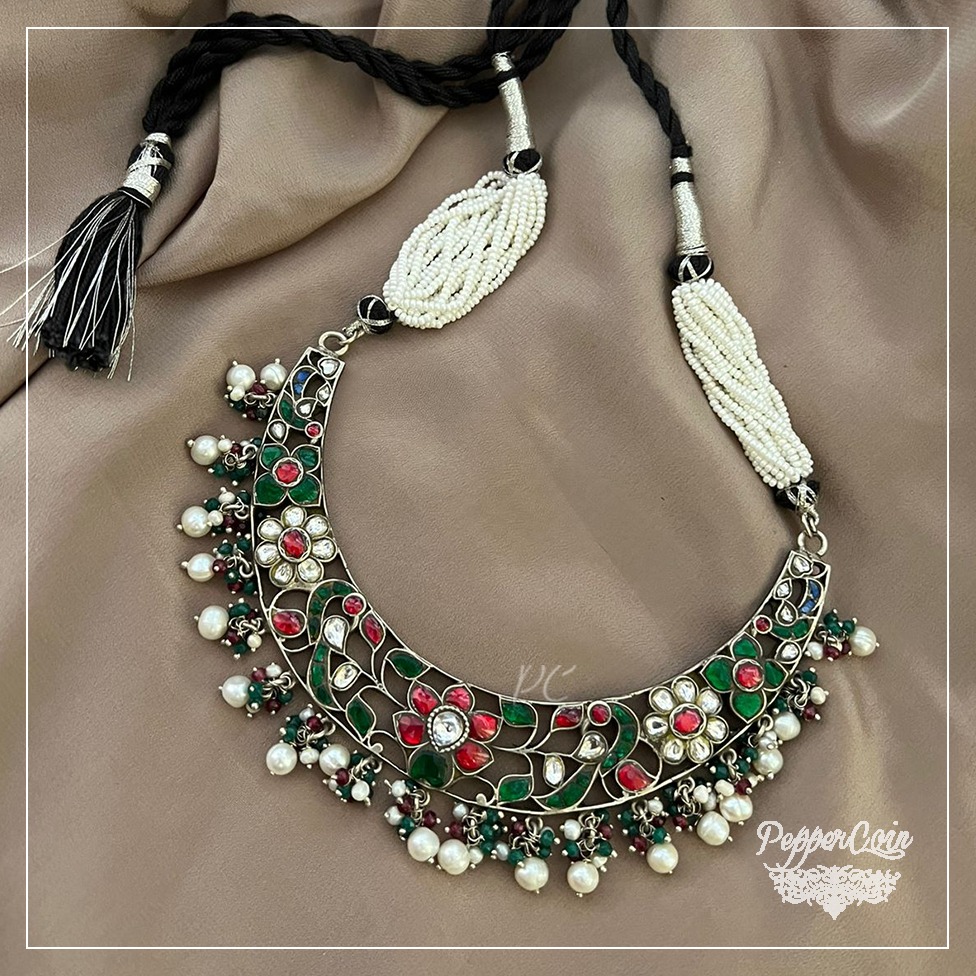 Flower work neck piece with ghungroo Material: 92.5 Silver Status: Available Length: 13 inches Weight: 80 grams Only for pendant you can