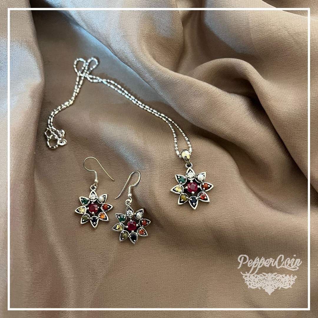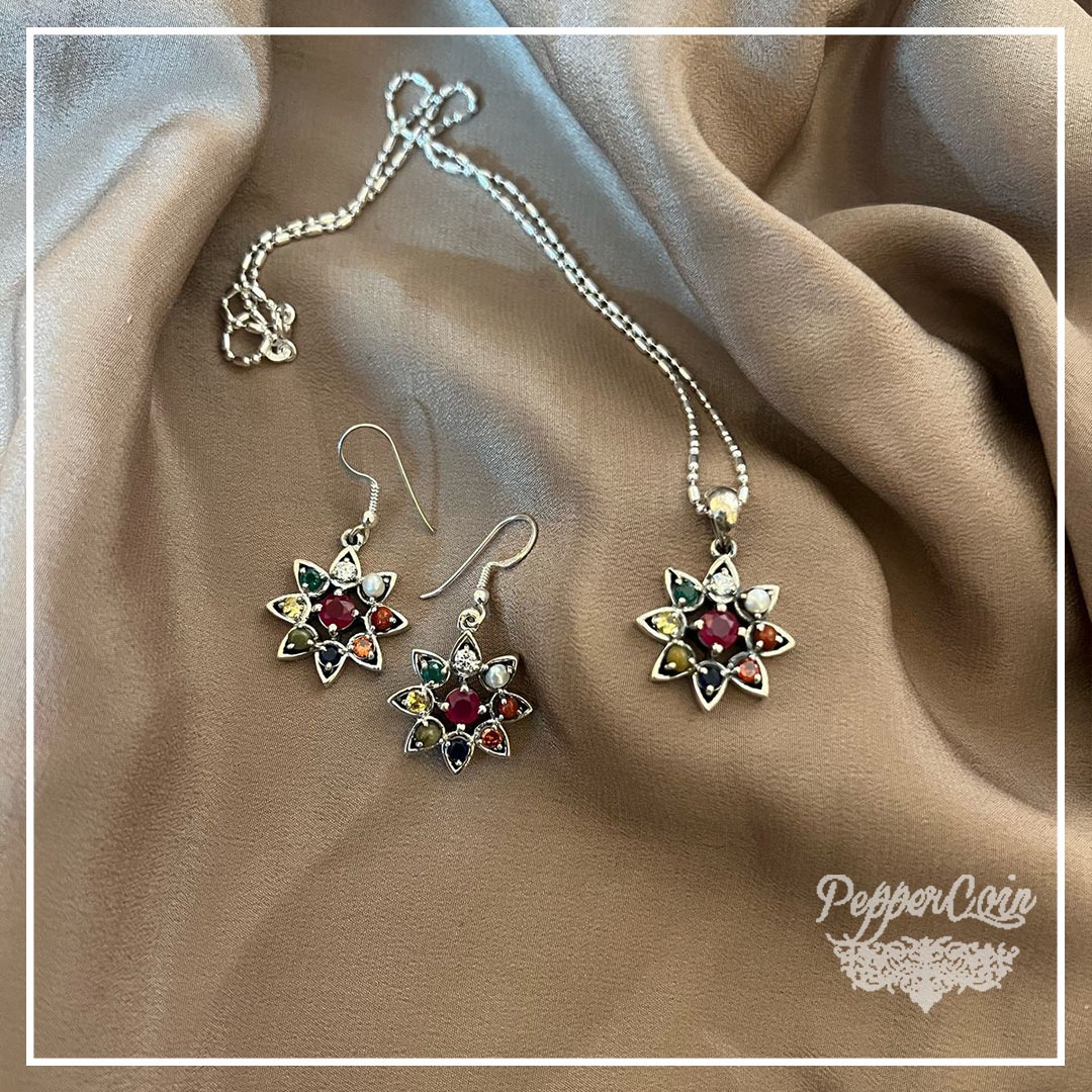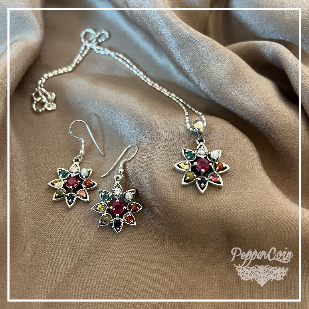 Beautiful amalgamation of stones set in silver Weight: 62 grams Material: 92.5 silver Status: Available Necklace and Earrings set. Care : Keep