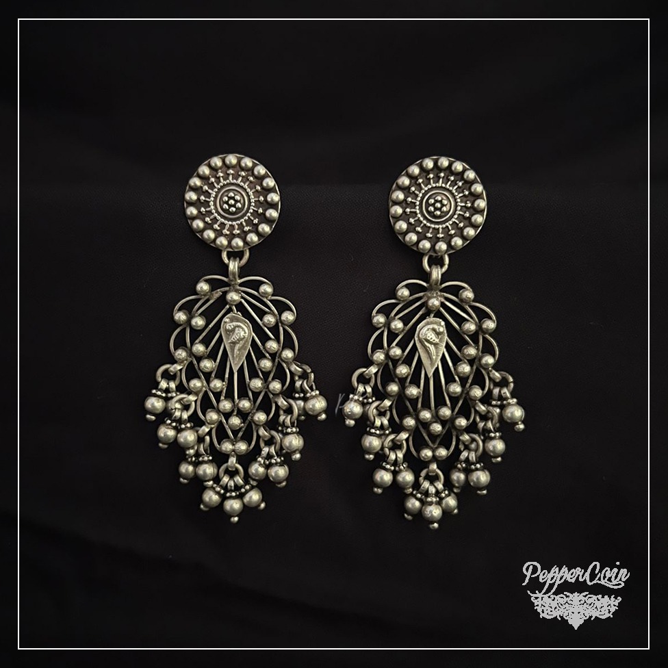 Beautiful Jali Work Done in Silver Weight: 9.3 Grams Length: 4.2 cm Fastening: Stud Material: 92.5 Silver Status: Available Care : Keep