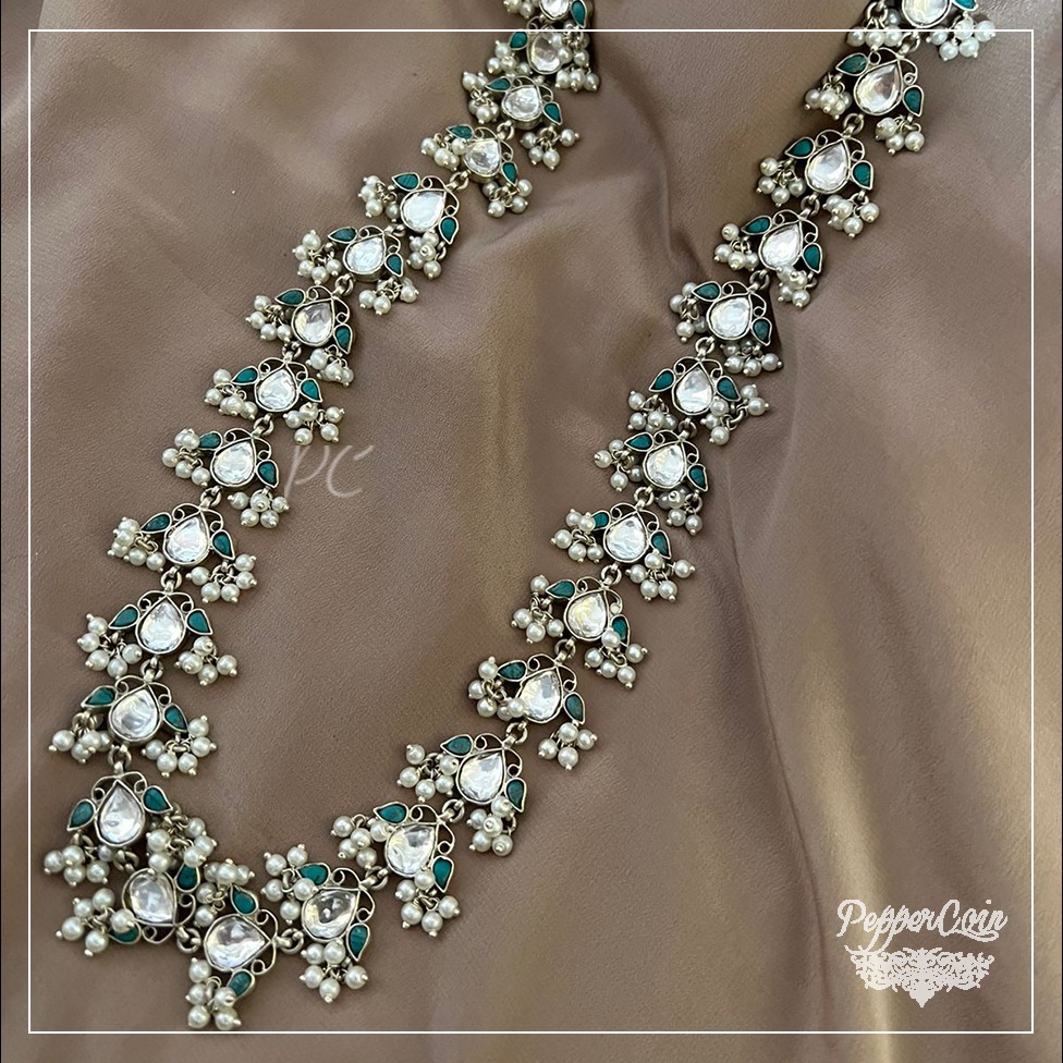 Beautiful Kundan Long Necklace With Torquoise and fresh water pearl Comes with extra link Chain to adjust it to a desired length.