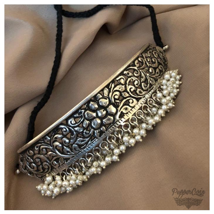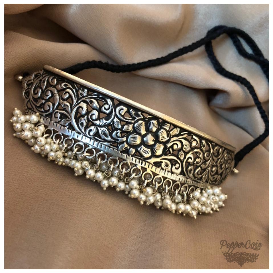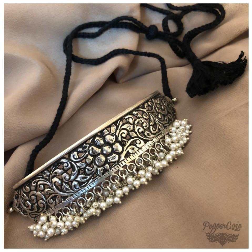 Choker with a hint of polki and good amount of fresh water pearls Weight: 48 grams Material: 92.5 Silver Status: Made to
