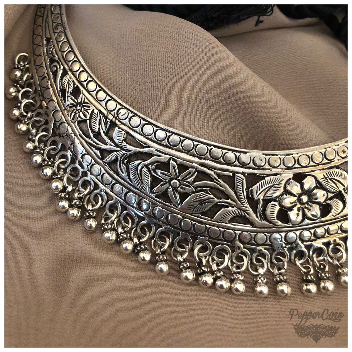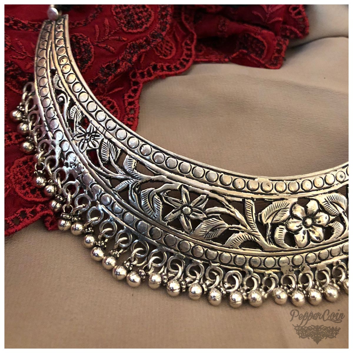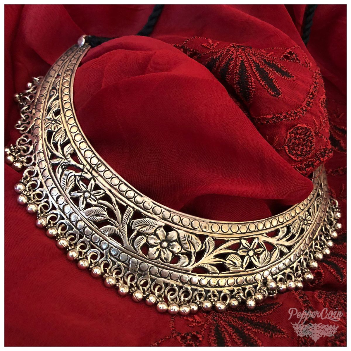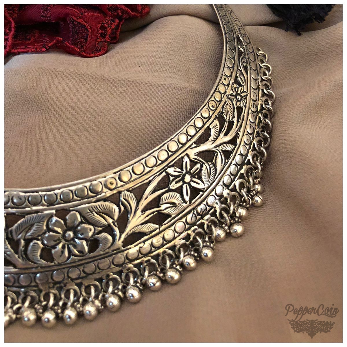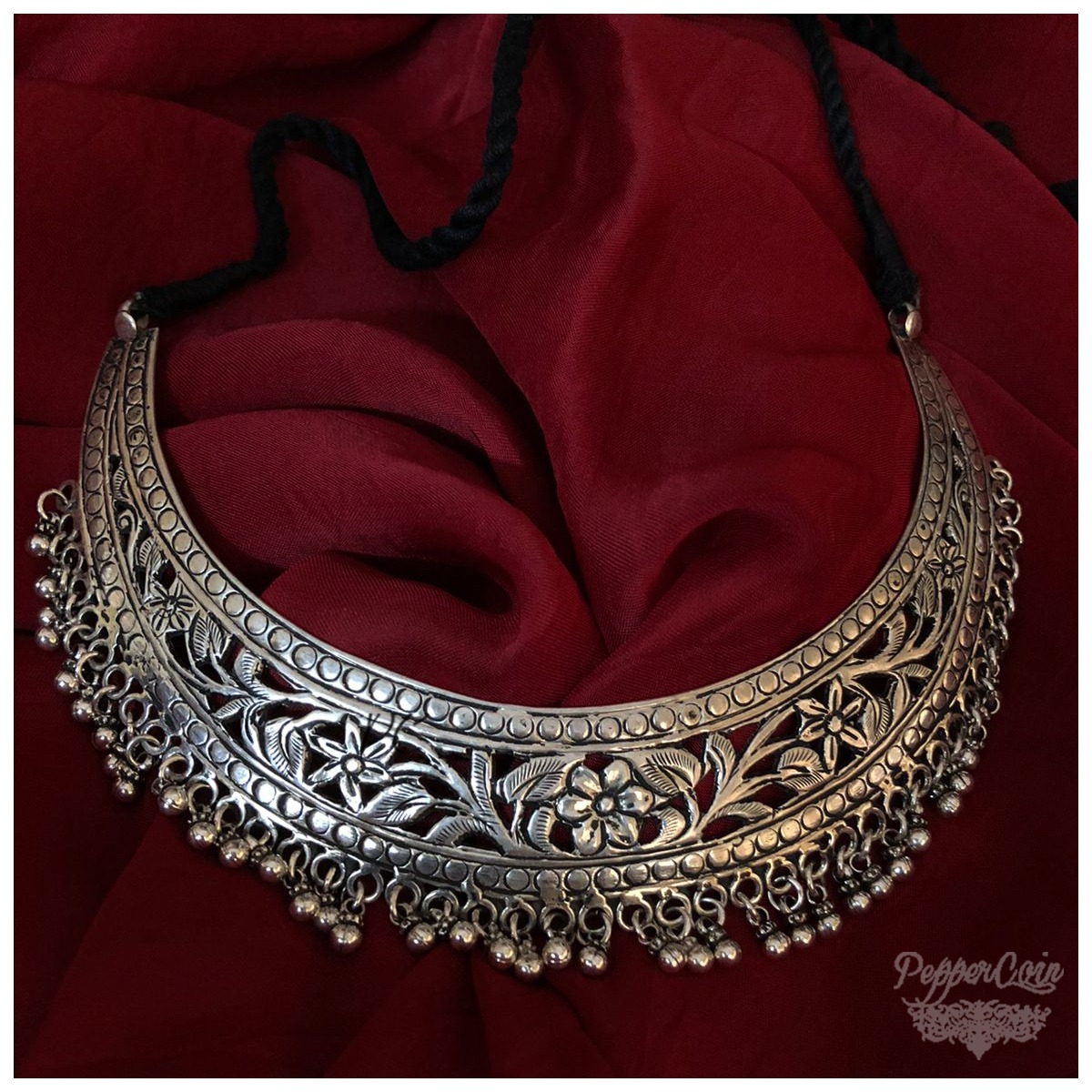 Flower work neck piece with ghungroo Material: 92.5 Silver Status: Available Length: 14.5 inches Weight: 74 grams Only for pendant you can