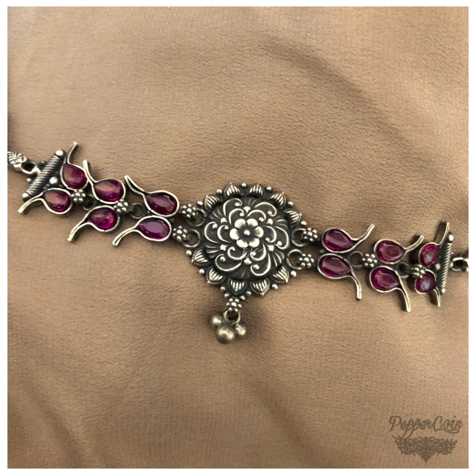 Flower work neck piece with ghungroo Material: 92.5 Silver Status: Available Length: 14.5 inches Weight: 74 grams Only for pendant you can