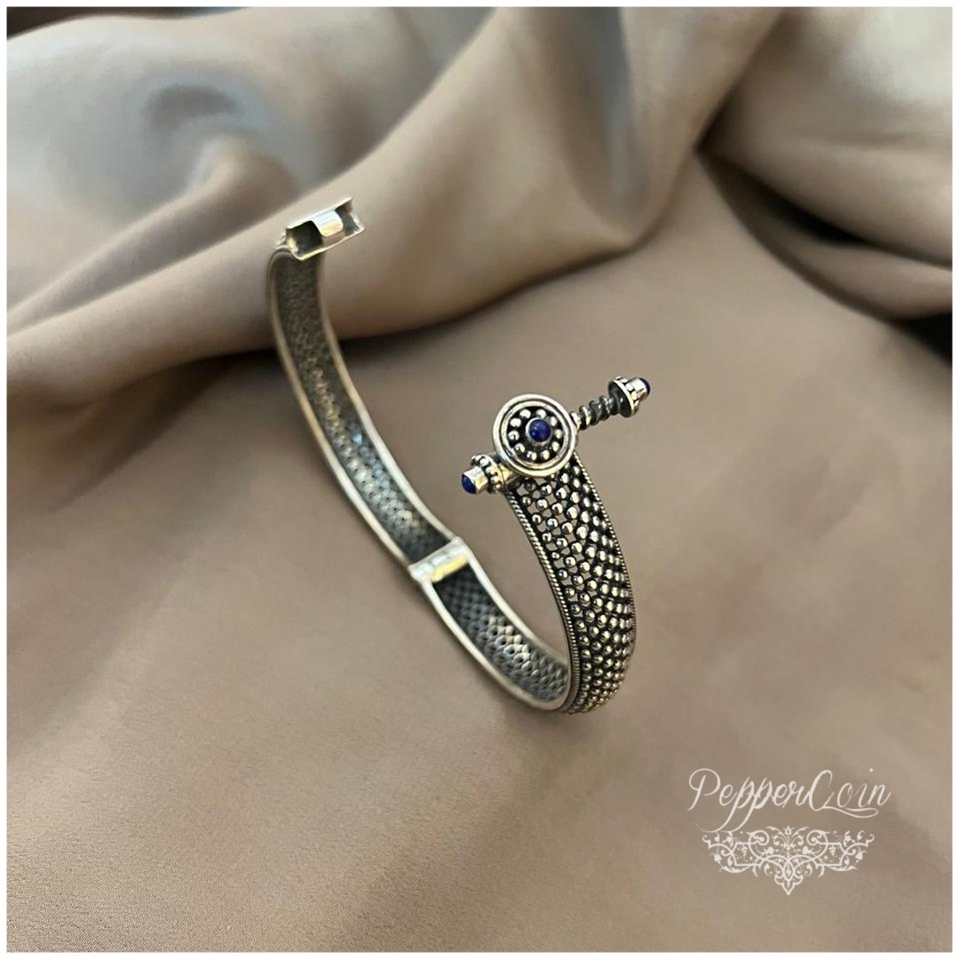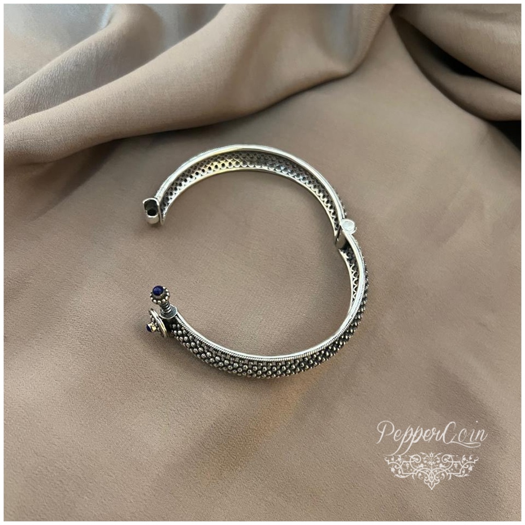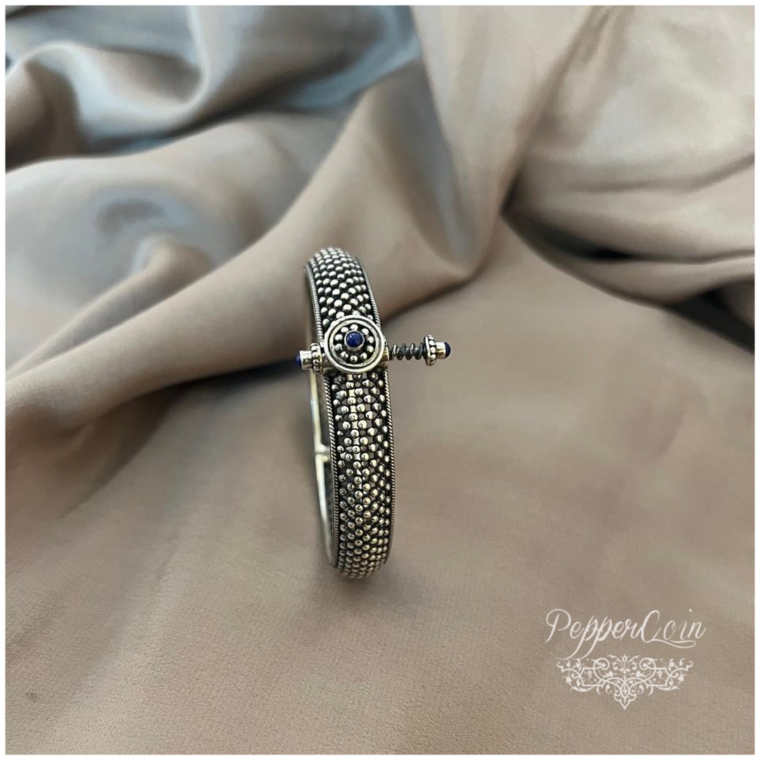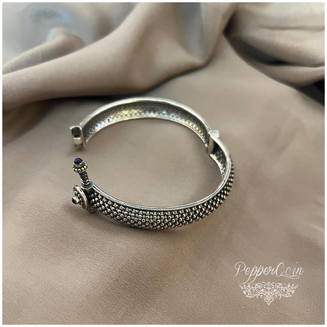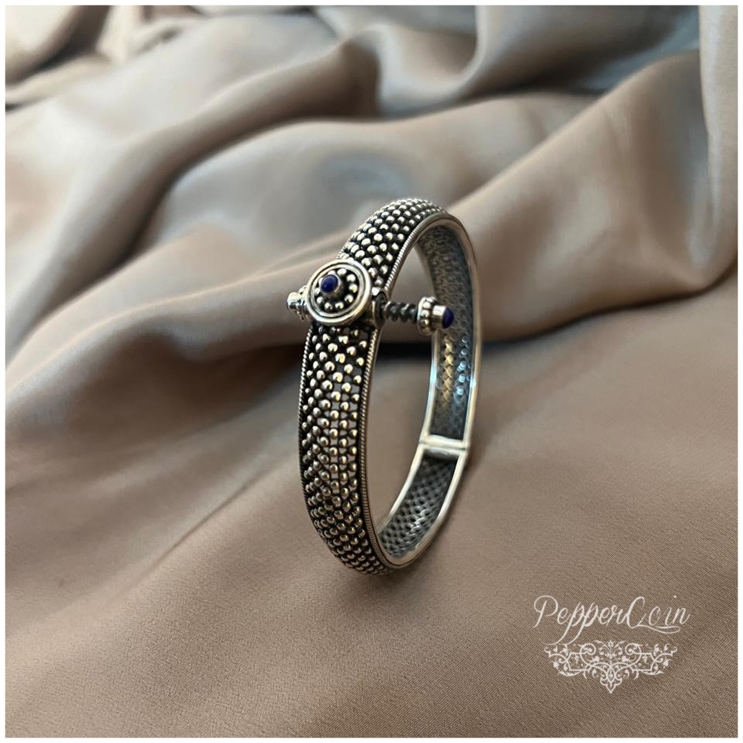 Jali dana work (dot pattern work) kada in silver with lapis lazuli stone comes with openable screens make it easy to wear.