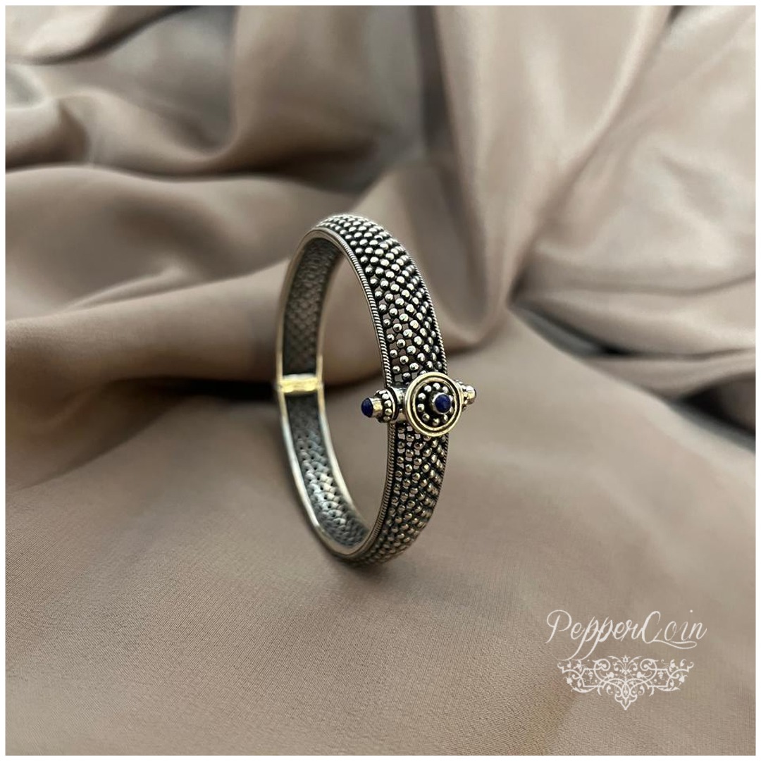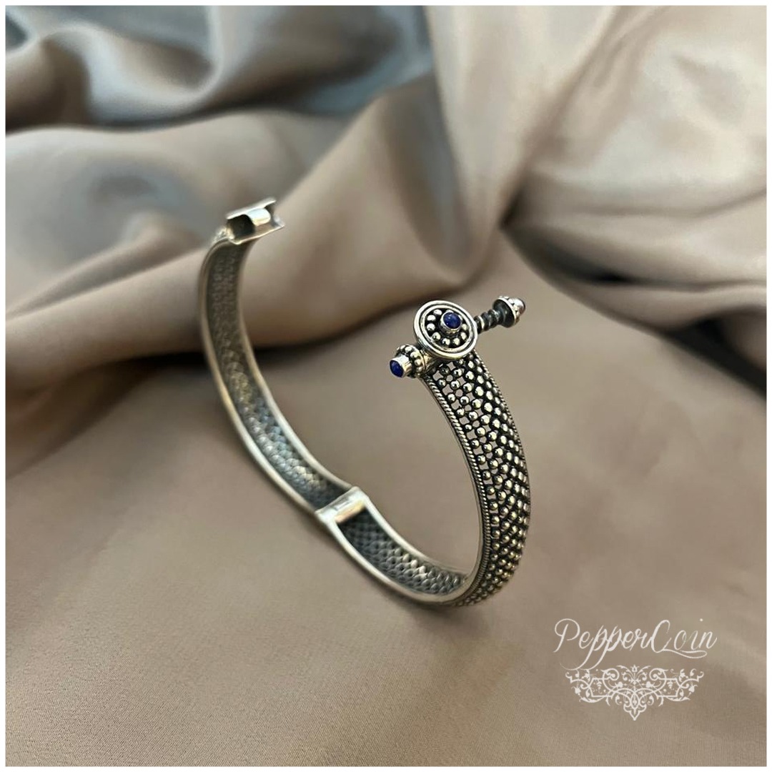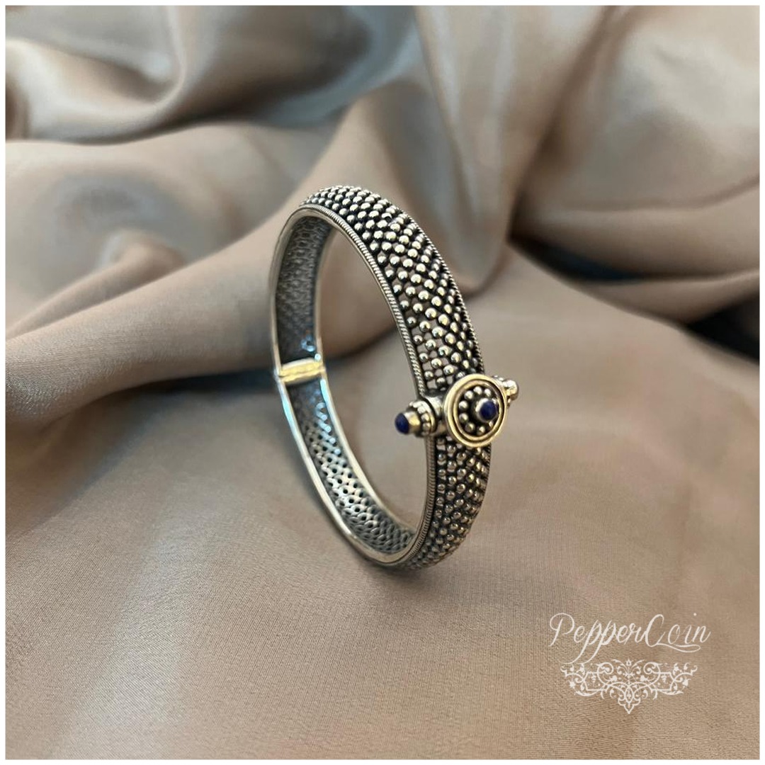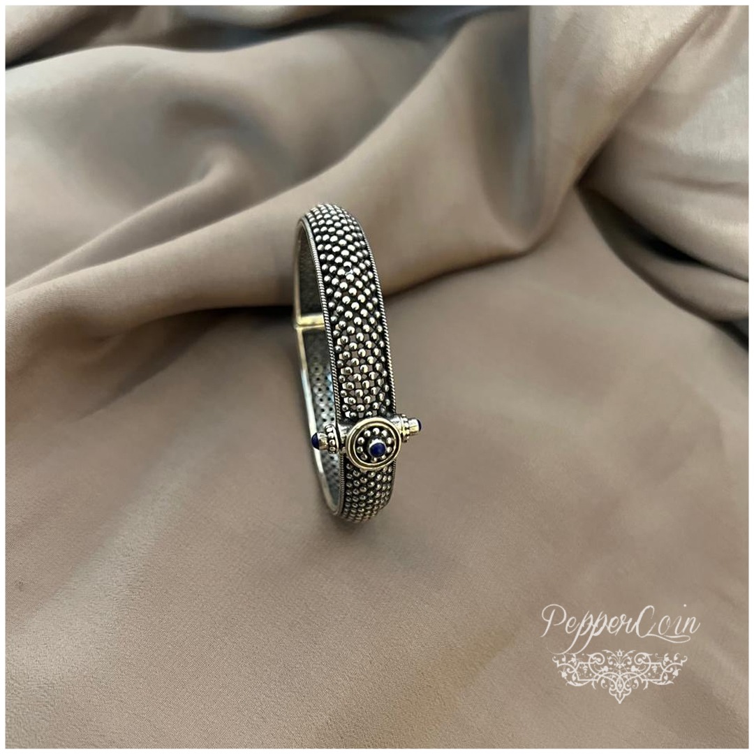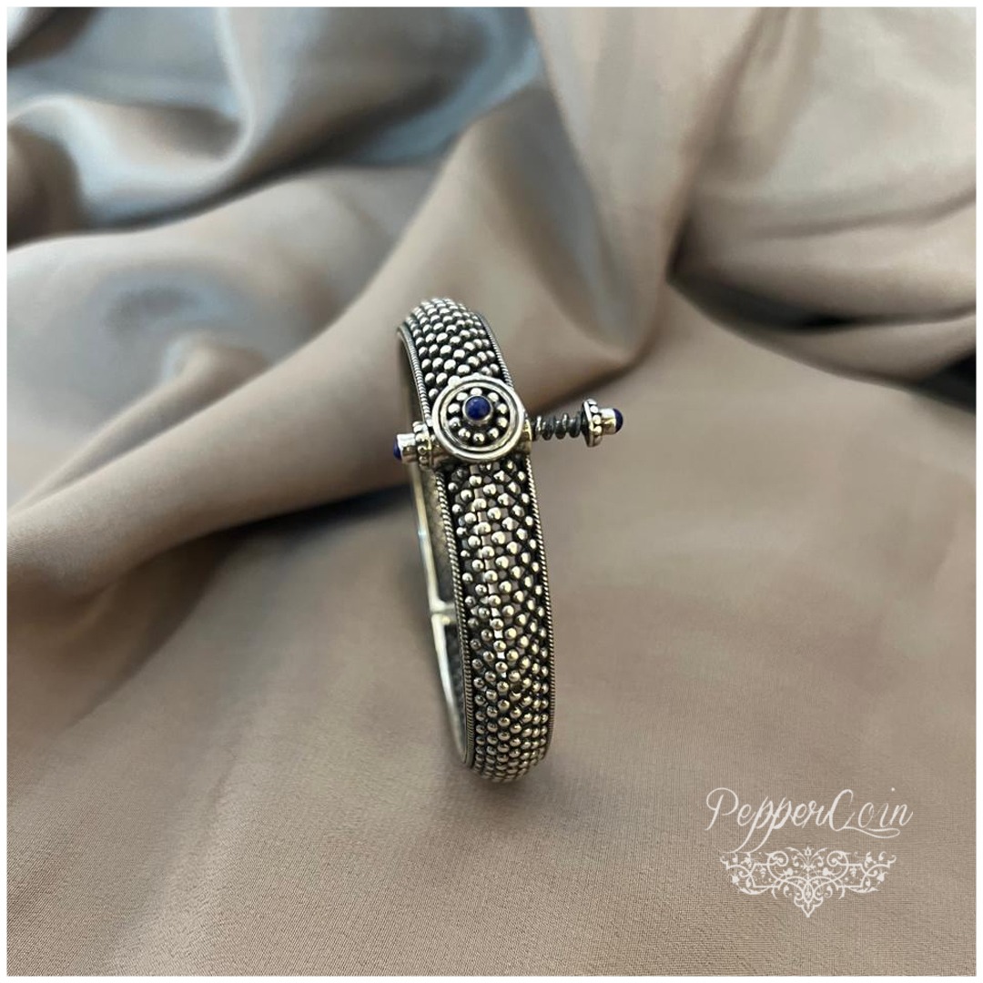 Jali dana work (dot pattern work) kada in silver with lapis lazuli stone comes with openable screens make it easy to wear.