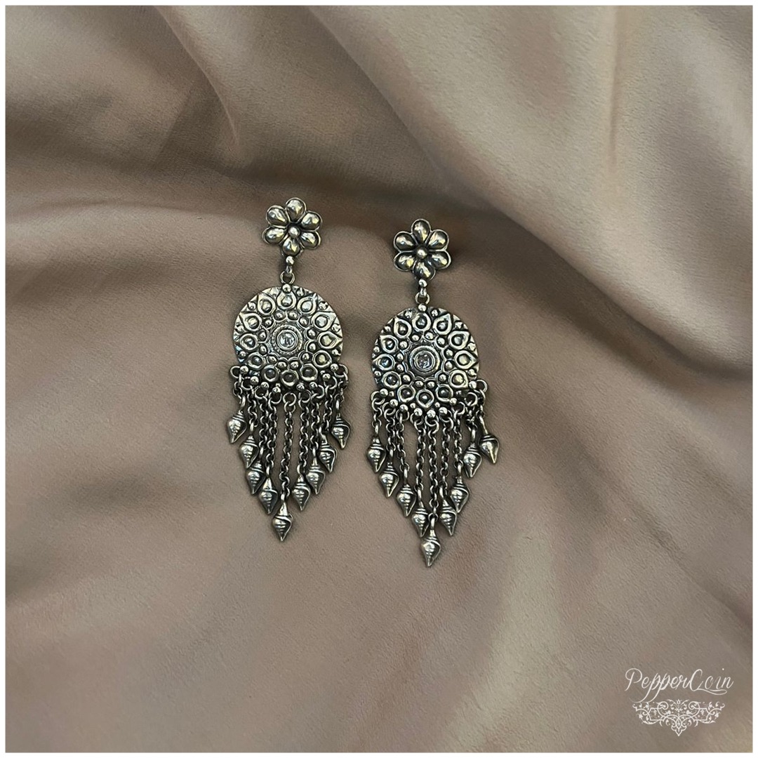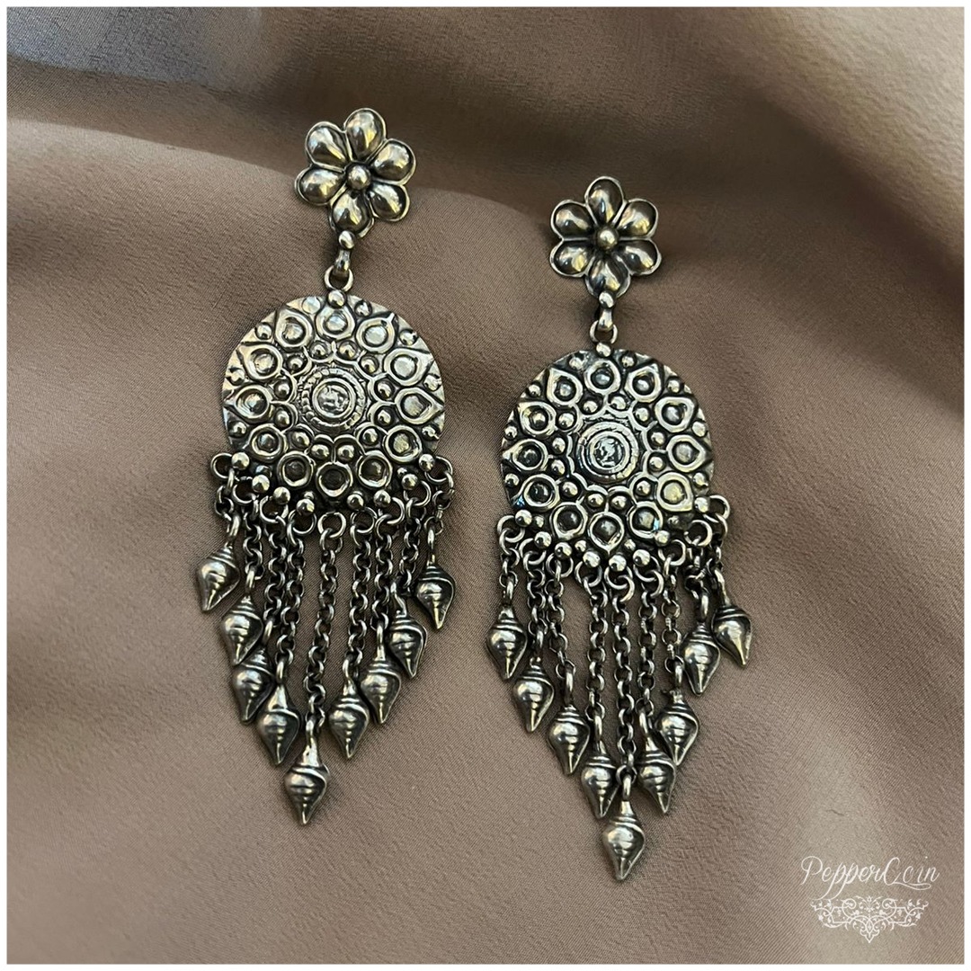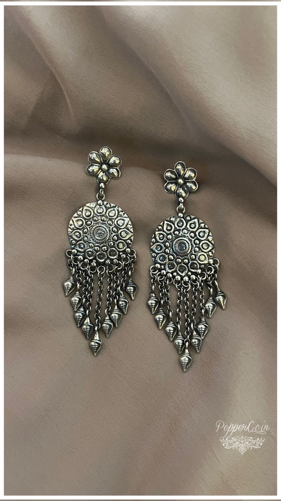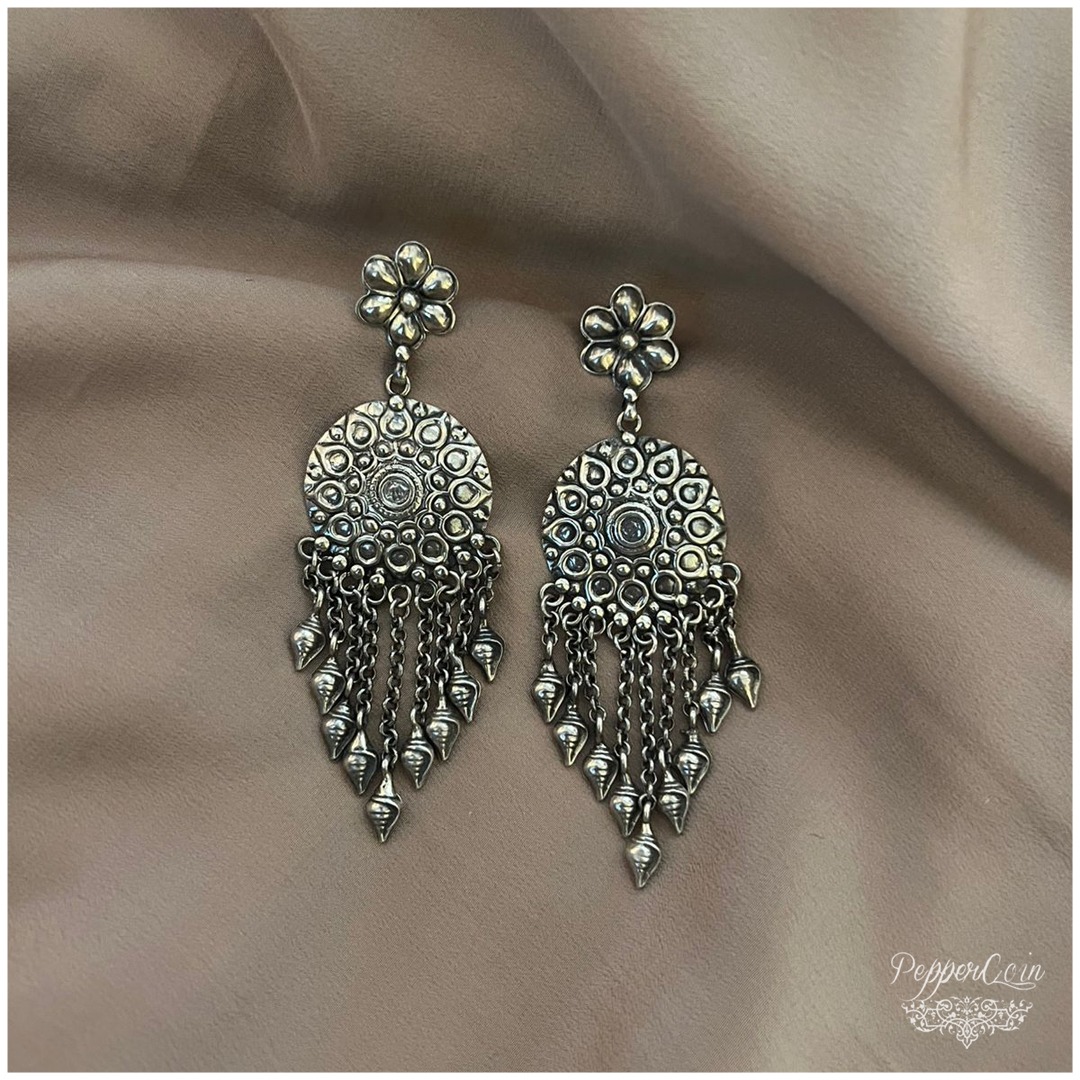 Beautiful Jali Work Done in Silver Weight: 9.3 Grams Length: 4.2 cm Fastening: Stud Material: 92.5 Silver Status: Available Care : Keep